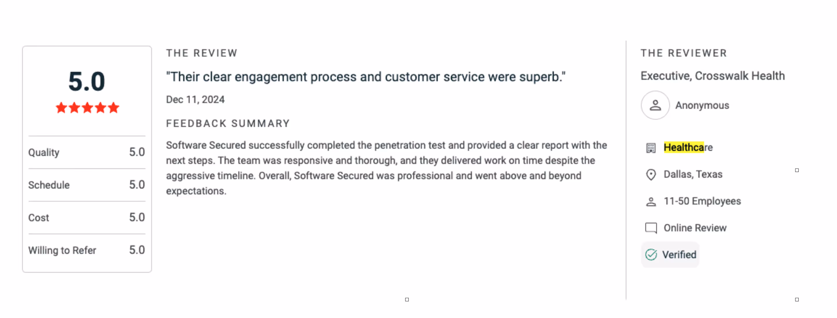 At Software Secured, we manually hack healthcare apps for a living. Our team works with fast-moving healthtech companies to uncover real risks, not checkbox findings. One client put it best: “Software Secured successfully completed the penetration test and provided a clear report with the next steps. The team was responsive and thorough, and they delivered work on time despite the aggressive timeline. Overall, Software Secured was professional and went above and beyond expectations.”