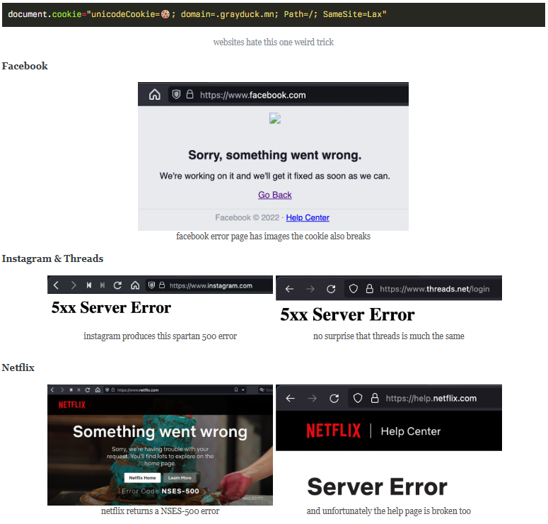While often perceived as low risk, this class of issue has affected several major platforms such as Facebook, Instagram, Netflix, WhatsApp, and Amazon, due to server-side assumptions about cookie character sets. Enforcing proper input validation and encoding is essential to avoid these types of failures.