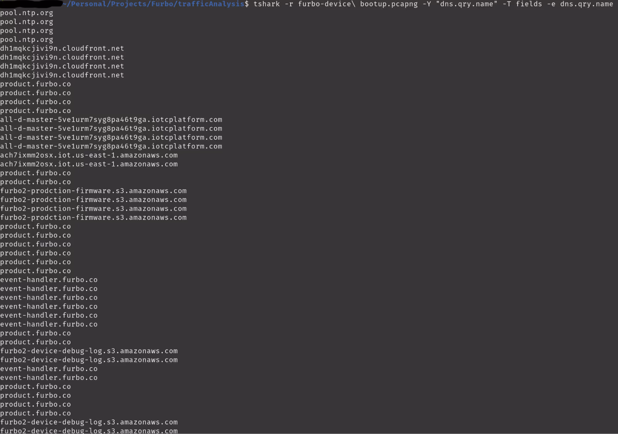 Following this win we wanted to see what other servers the device communicated with. We saved our PCAP and ran tshark on the PCAP. With this we were able to retrieve a list of all of the domains with which the Furbo device communicated during the boot up process.