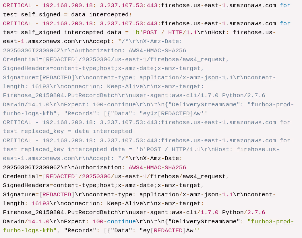Our first win came soon after the device booted up. Certmitm successfully downgraded the TLS traffic and decrypt its contents on one endpoint which the device talked to: firehose.us-east-1.amazonaws.com