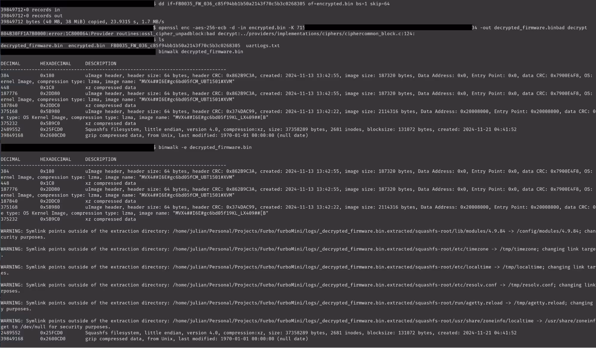 While finding the URL for the exact firmware version in use was a win, we were quickly presented with another challenge. This firmware was encrypted and running binwalk on the file returned nothing of value. After trying countless ways to decrypt it with the SecretKey in the previous screenshot, we realized that it was not working because we had not hex-encoded the SecretKey.