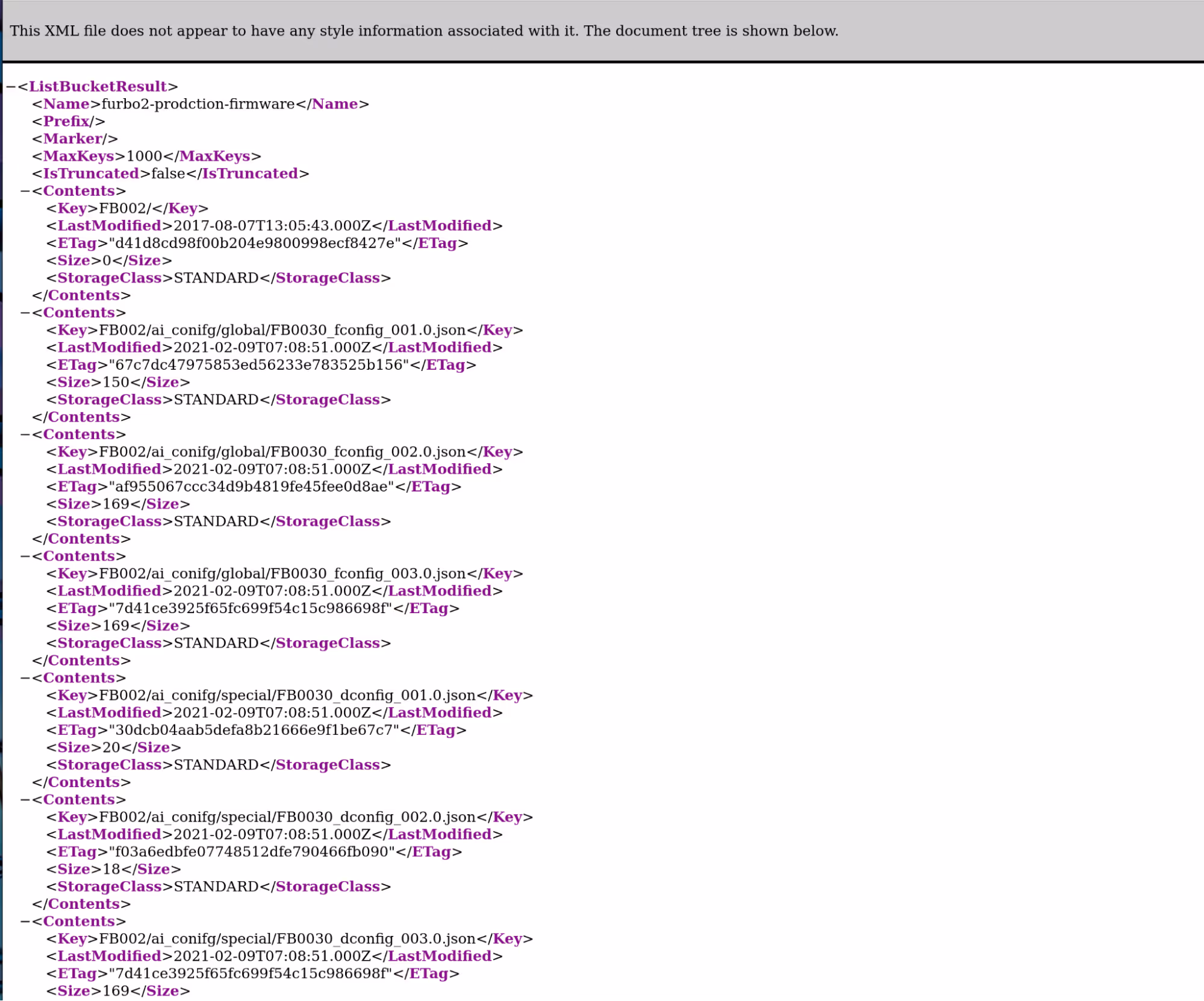 Of special interest to us and our analysis were the requests to the firmware S3 bucket. Navigating to the endpoint, we found that it provided us with a listing of its contents.
