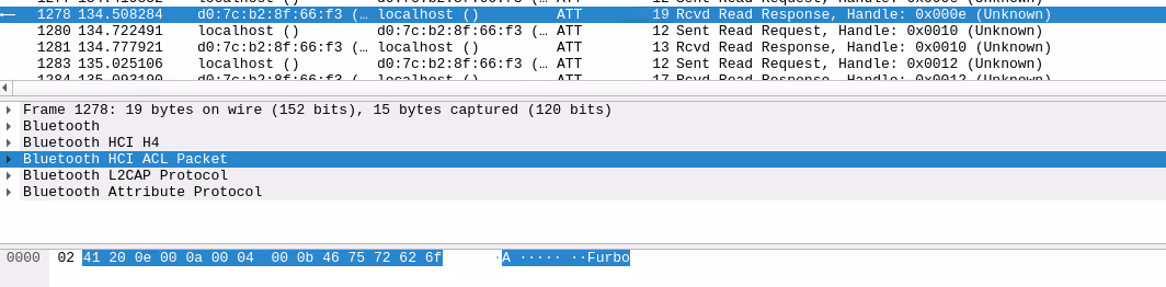 After digging up the btsnoop_hci.log file, we pulled it into WireShark where we could more easily analyze the communications. There were a ton of logs to parse, so we applied the btatt filter to reduce it some and found the first destination which was a MAC address and started from that point. This packet was our first indicator that we were focusing on the right device.
