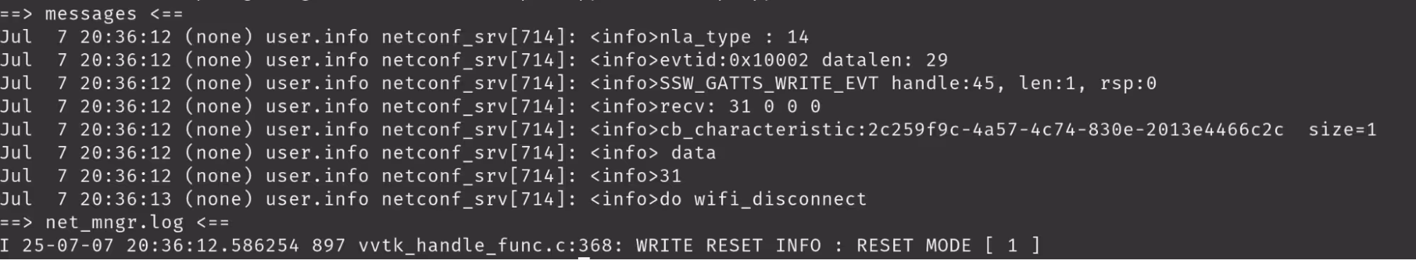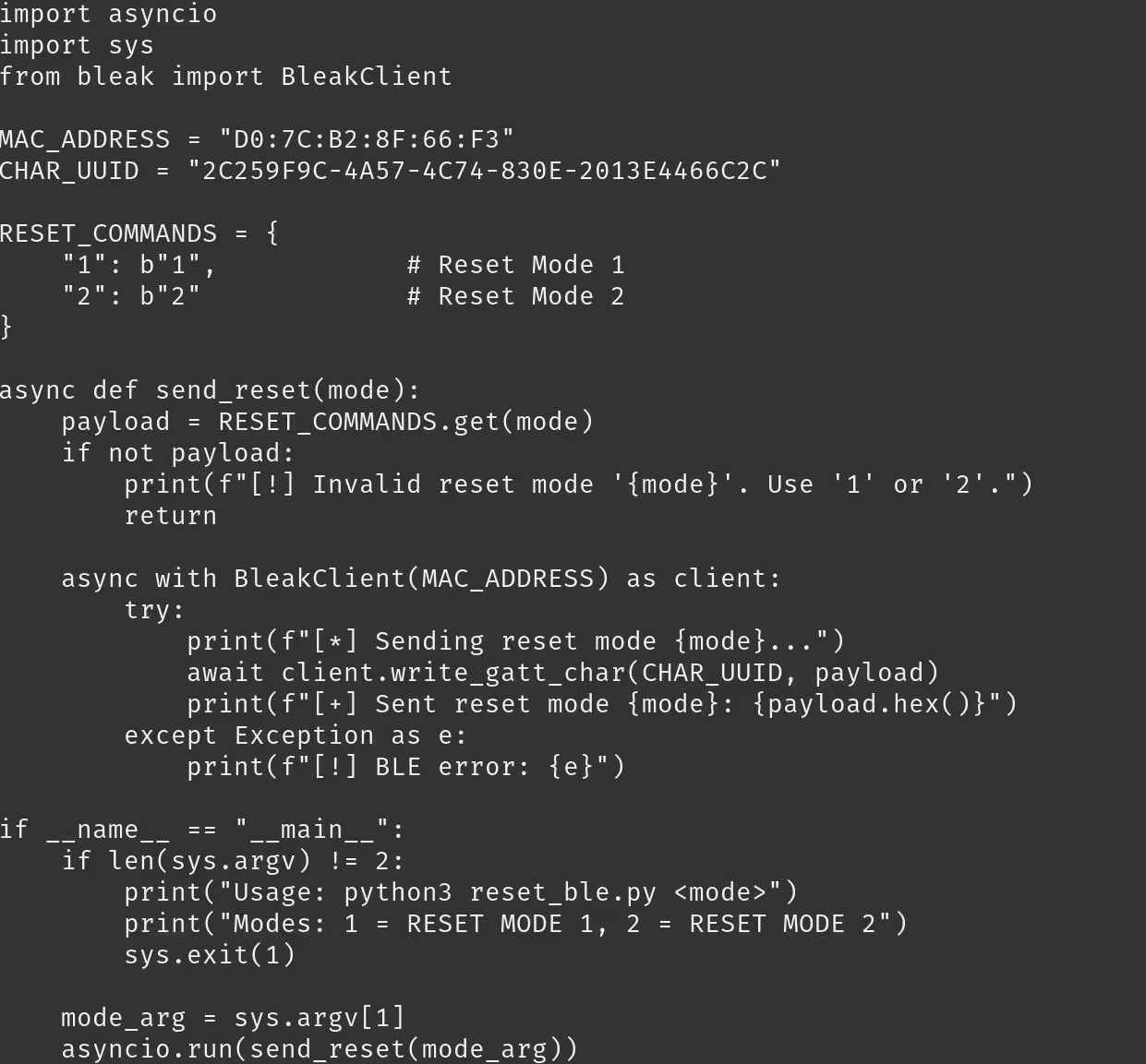 This brings us back to the previously mentioned reset modes we discovered through fuzzing: the second of which was the “Hard Reset”, this is where things got interesting. When we first ran the full reset command we didn't notice much of a difference compared to the "Soft Reset". The device went offline, but when we tried to scan for any other characteristics there were none to be found.
