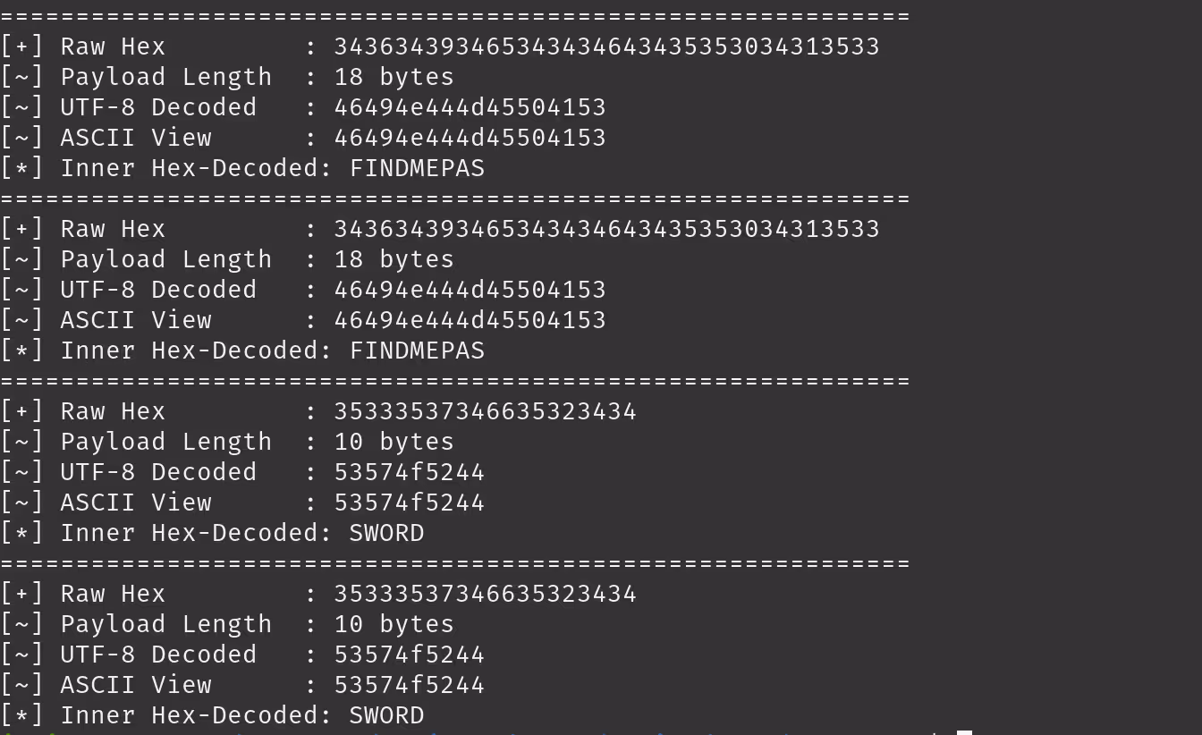 Reviewing more of the packets, we realized that much of the communications were split up across several sends, meaning it would be challenging to decipher what exactly was being sent or received. It also seemed as though that some of the data may be hex encoded based on the packets seen in Wireshark. Rather than trying to piece it all together, we grepped out any possible hex values and whipped up a Python script which would parse the log file and hopefully extract whatever data we were looking for.