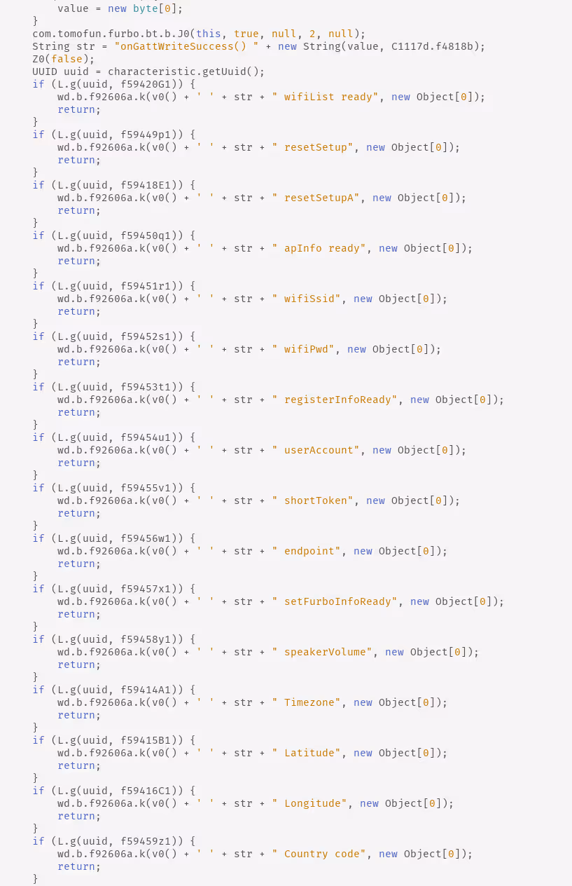 And with that, we had our first BLE vulnerability. The passwords and SSIDs which were sent to a Furbo device were being communicated over BLE in an unencrypted format!