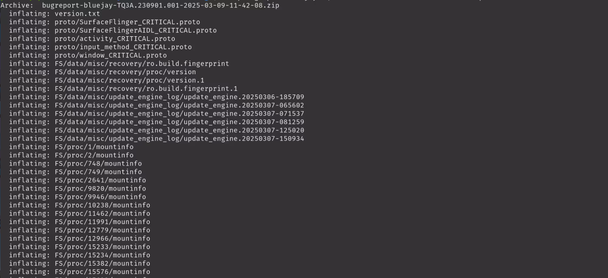 We then pulled the report with adb bugreport <filename> onto our host machine and unzipped the archive.
