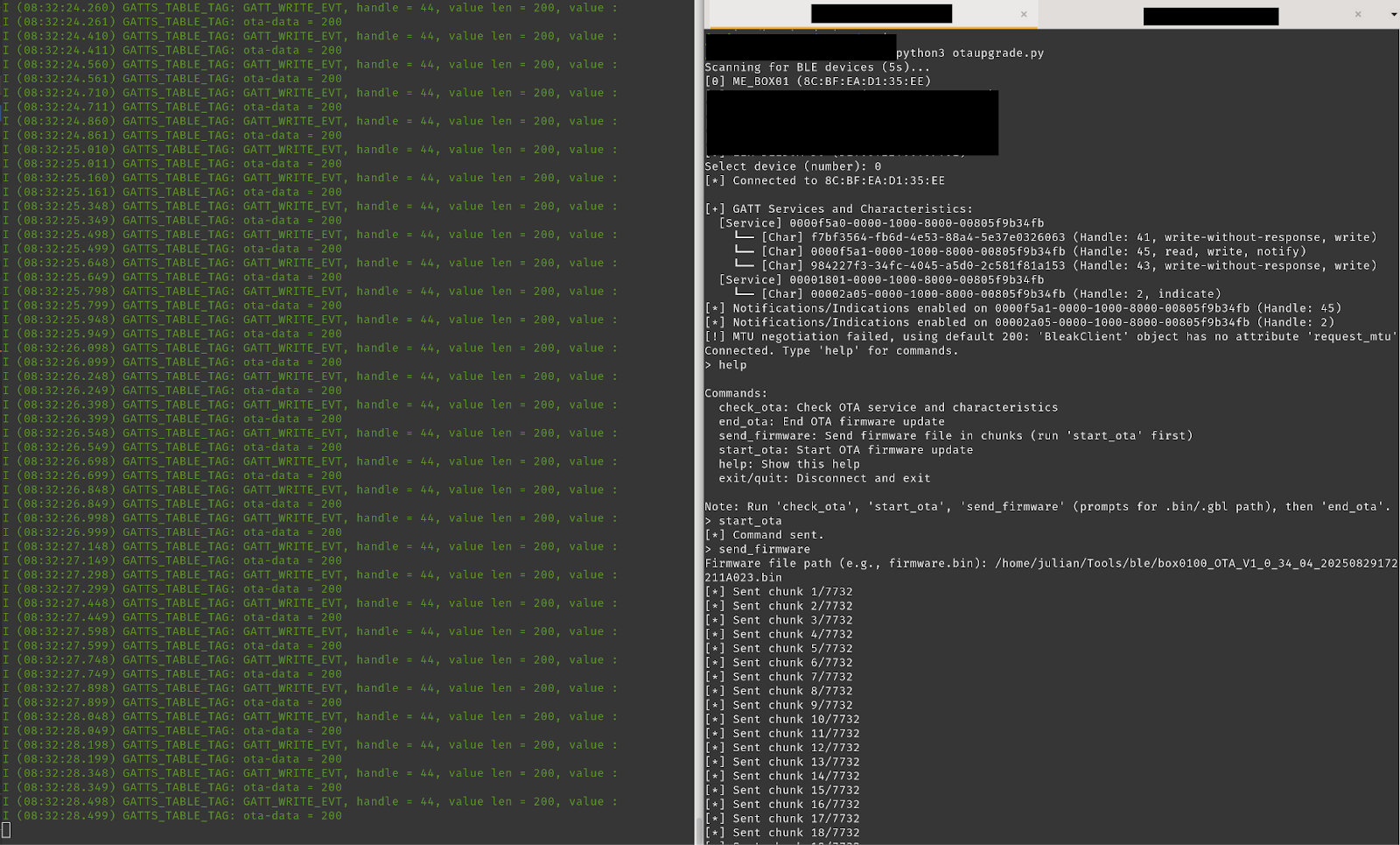 When reviewing the mobile device traffic we were fortunate to discover a copy of the firmware located on a storage bucket that we could pull down to test whether or not this would work. In order to verify whether this was working correctly we connected to the device over UART to monitor the logs, in the screenshot below you can see the UART logs on the left and the BLE script on the right.